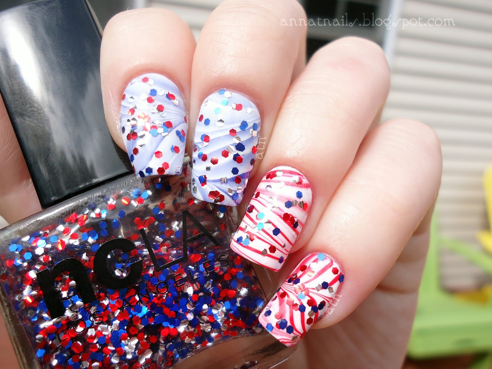 This manicure is the same as in the previous post, except I added my favorite 4th of July glitter "United States of Glitter" by NCLA on top of the watermarble.